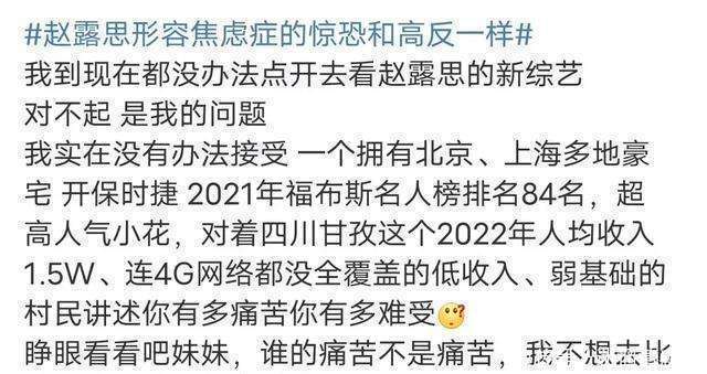 在综艺里,她和山区孩子的相处更是引发了诸多争议。当她和山区孩子诉说自己的疾病,说自己躯体化,记忆变差,每天只睡2个小时之类的情况时,网友们纷纷表示质疑。她作为一个有钱人,和农村山区的孩子诉说自己的苦,这多少有点“不食肉糜”的感觉。我觉得在贫富差距较大的情况下,这种交流很容易产生误解。山区的孩子可能每天面临的是基本生活物资的匮乏,而她所谓的病痛虽然也值得同情,但在这种情况下拿出来比较,就不太合适了。