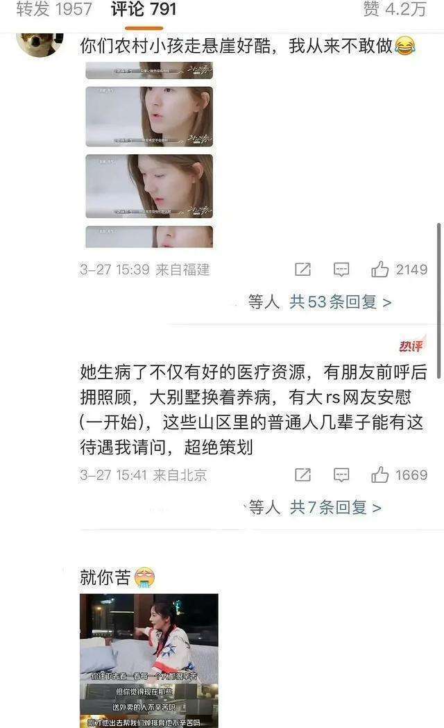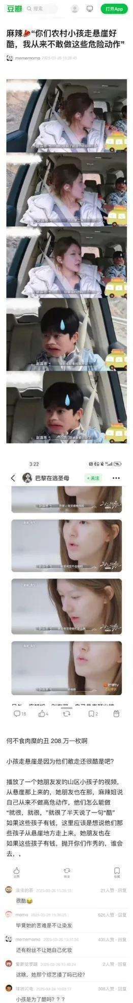 还有她和山区小女孩关于艺术照的那一段互动。她拿着自己小时候的艺术照问小女孩知不知道艺术照,有没有拍过。这一举动被观众一致认为很离谱,因为在那种情况下,很容易伤害到小孩子的自尊心。这就像是在一个本就充满敏感氛围的场景里,又投下了一颗石子,泛起了一圈圈涟漪,进一步破坏了她在观众心中的形象。而且她说山区孩子好勇敢,从小就敢走悬崖峭壁,自己都不敢挑战冒险项目。这其实是很缺乏常识的表现,山区孩子很多时候走那些危险的地方可能是生活所迫,而不是真的出于冒险的目的。
